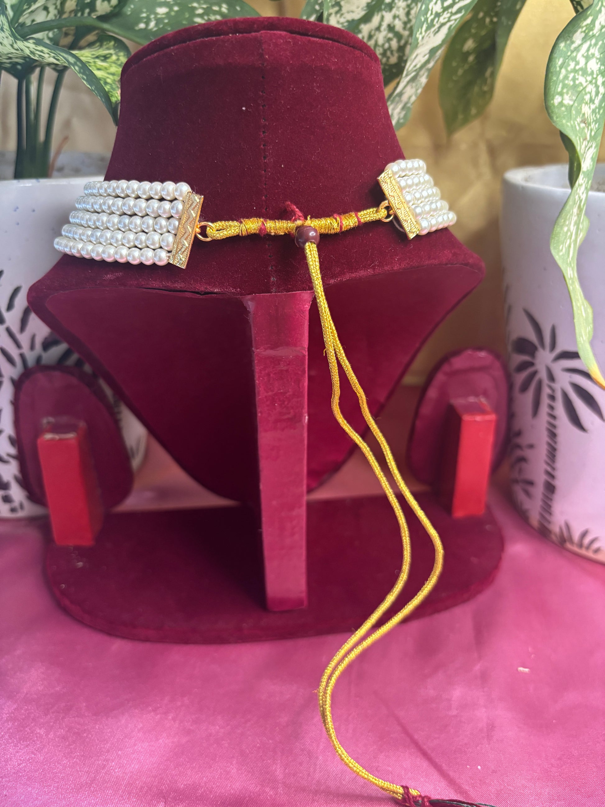 Add sophistication to your outfit with this green stone Kundan pearl necklace set. Designed with a traditional pearl base and paired with matching earrings this set is perfect for weddings, parties, and festive occasions. The deep green stones create a regal statement