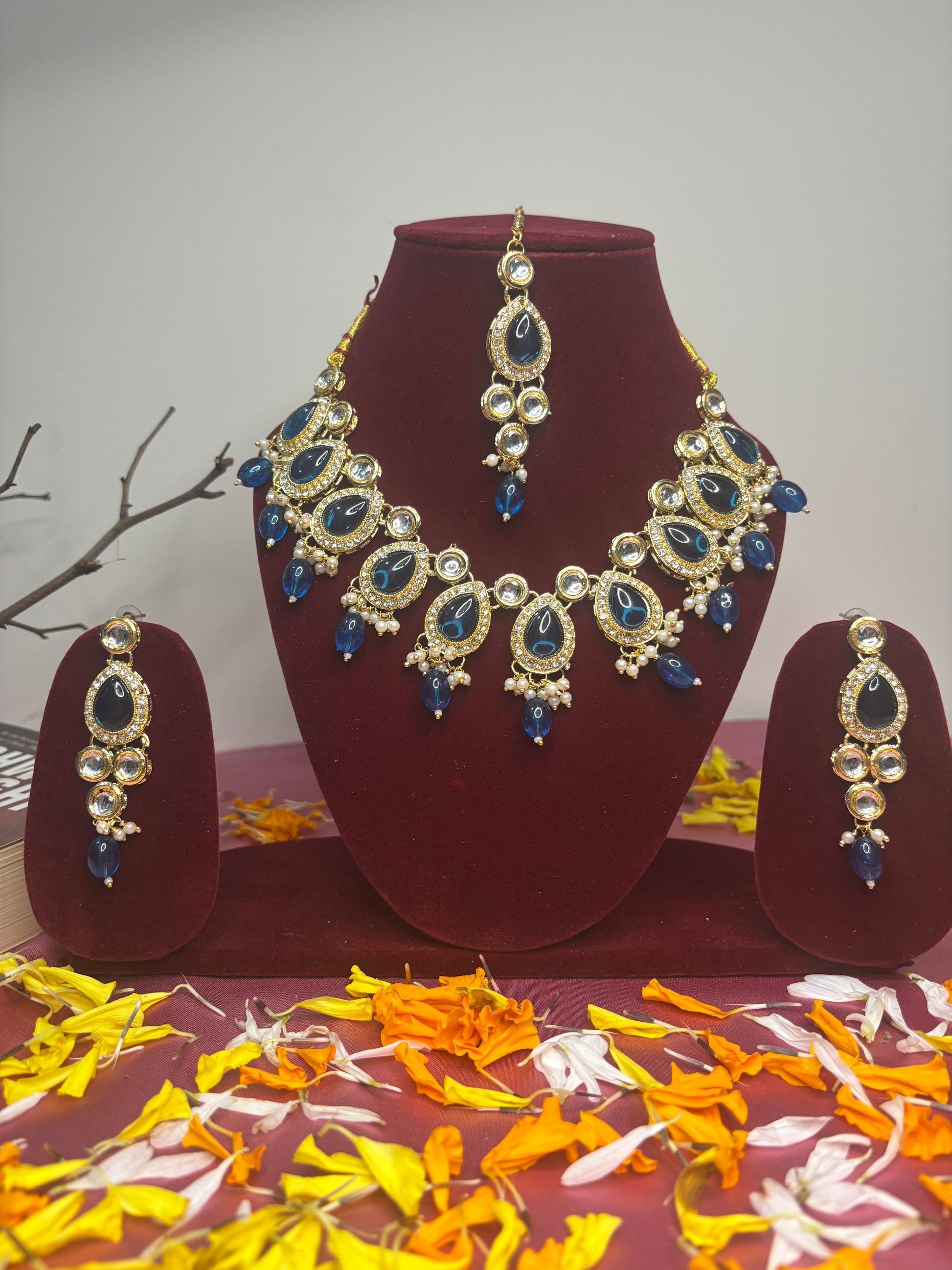 Kundan with Blue Monalisa Drop Jewellery Set | Necklace, Earrings & Maang Tikka