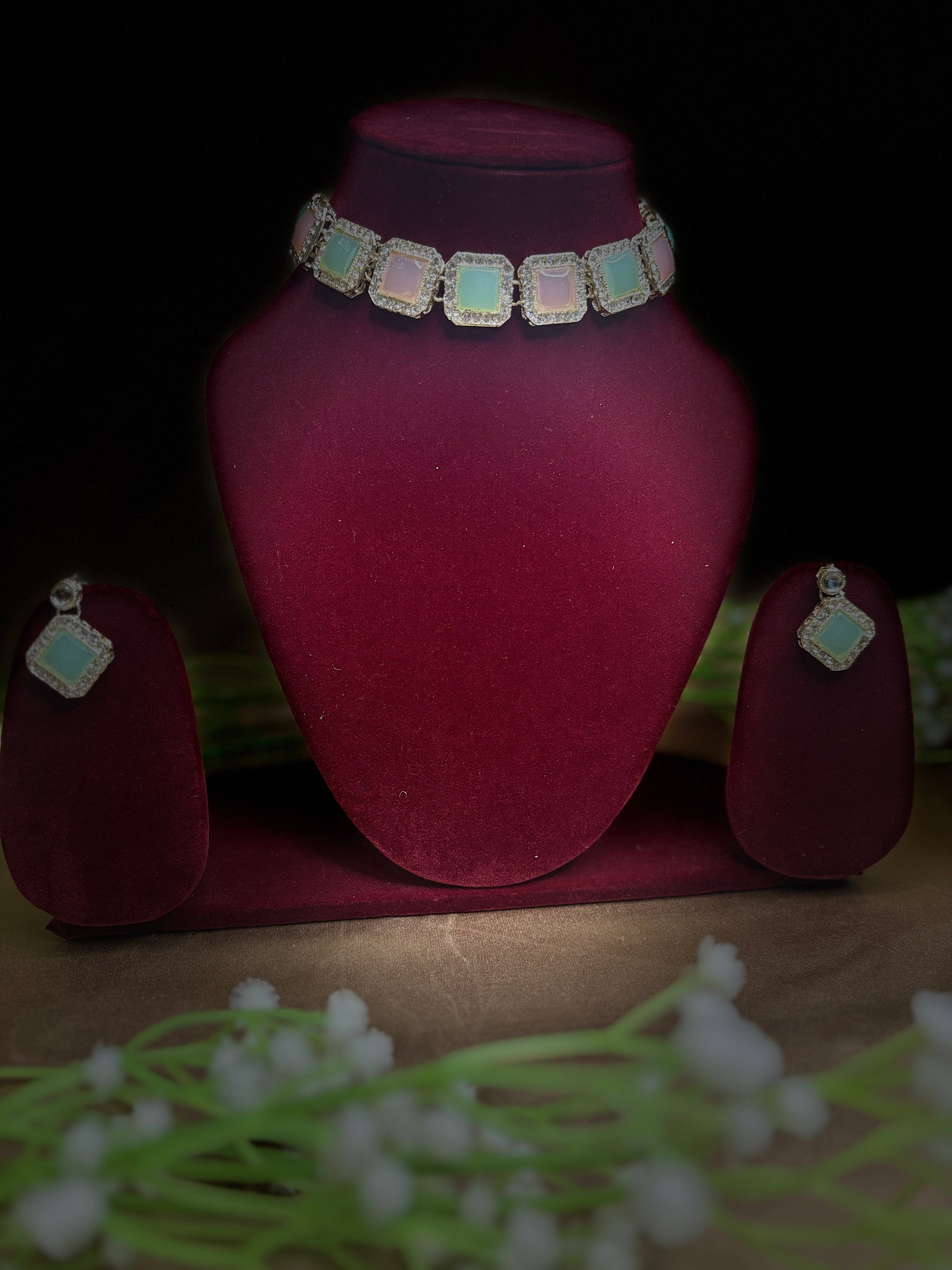 A vibrant choker necklace designed with multicolor square stones bordered by dazzling AD crystals. Paired with matching earrings, this set is ideal for weddings, parties, and festive occasions, adding a colourful charm and elegance to your ethnic look.