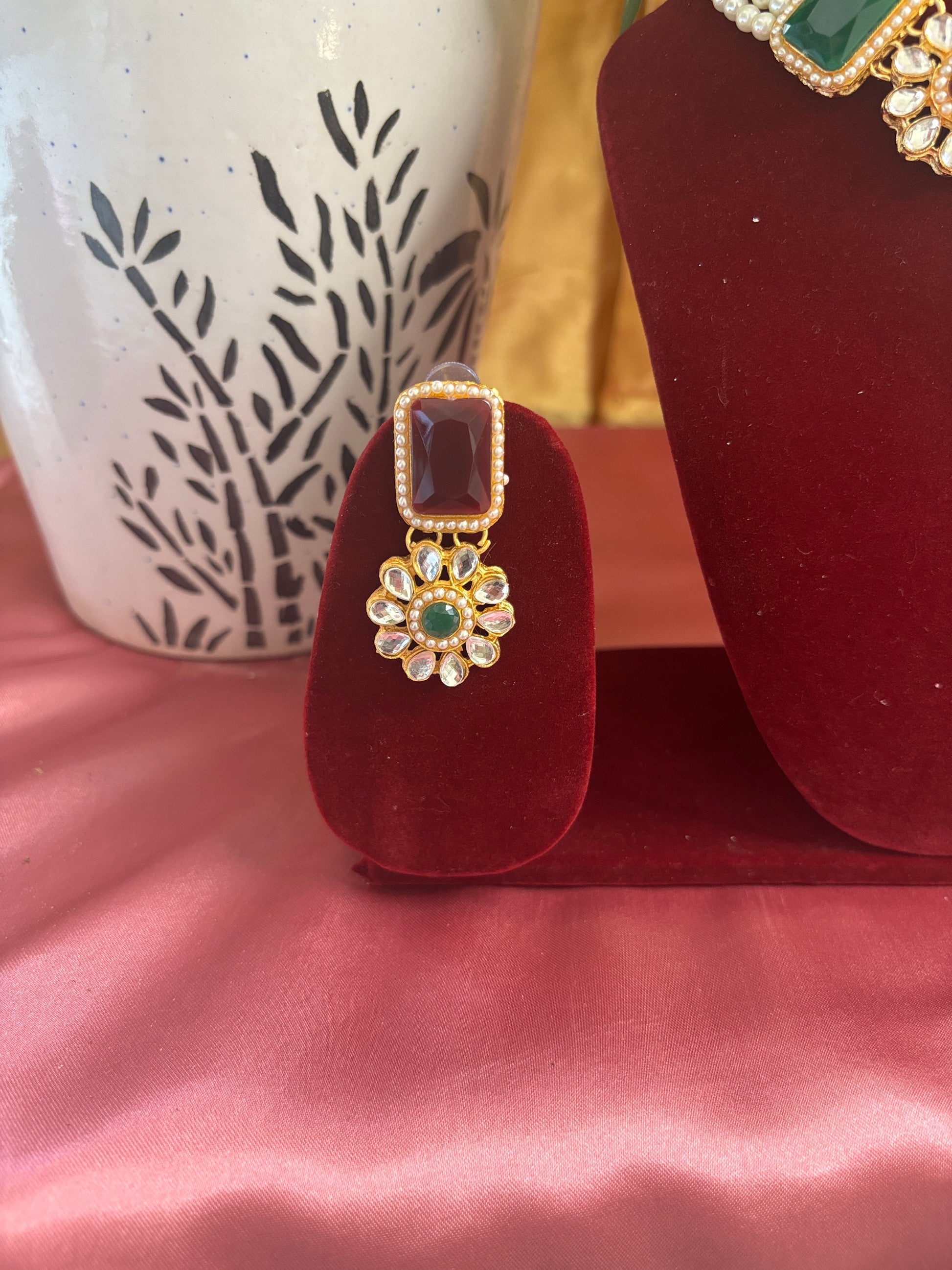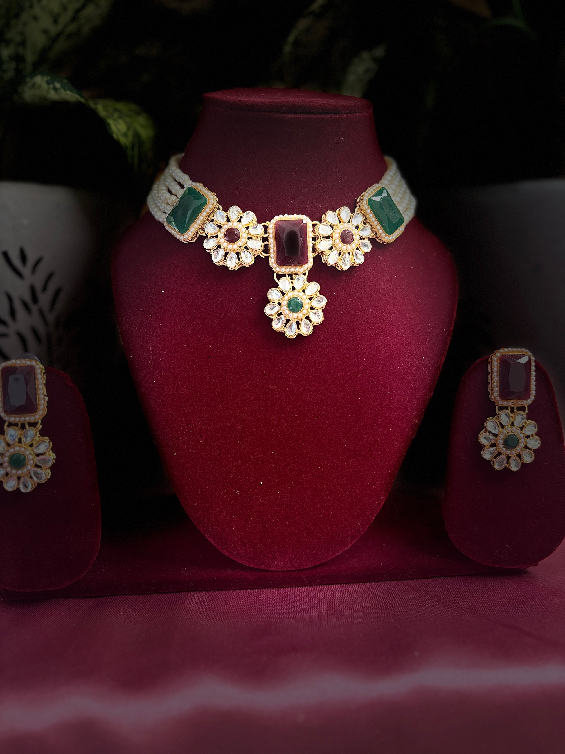 Red & Green Kundan Pearl Necklace Set with Earrings