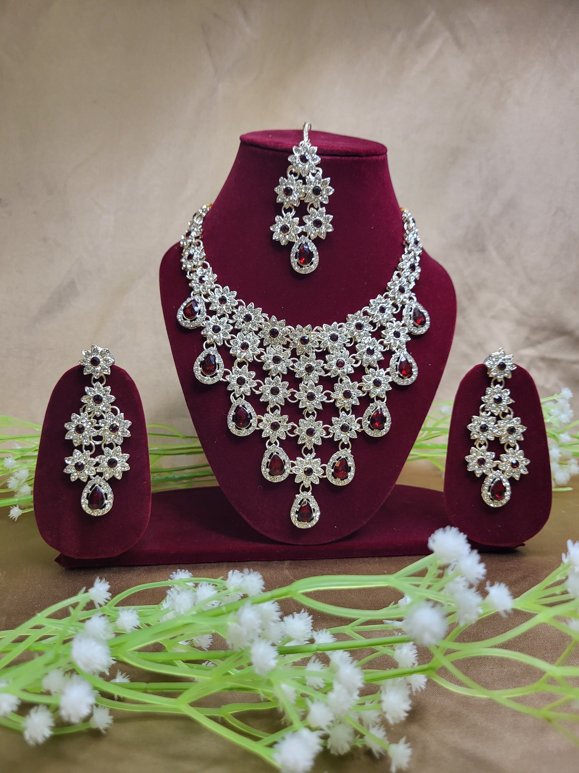 Red Stone Floral Necklace Set with Matching Earrings and Maang Tikka