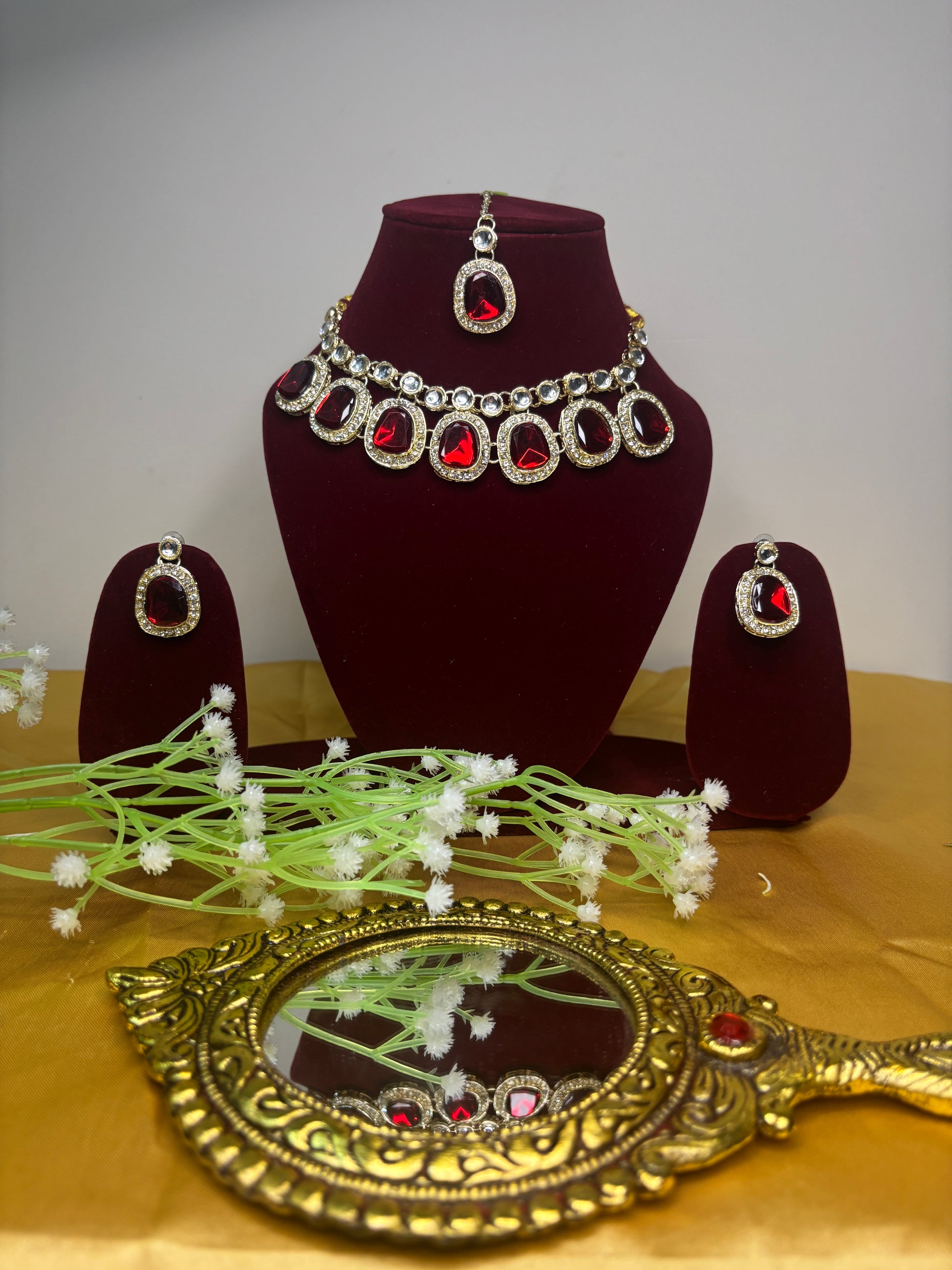 Red Stone Kundan Necklace Set with Earrings & Maang Tikka