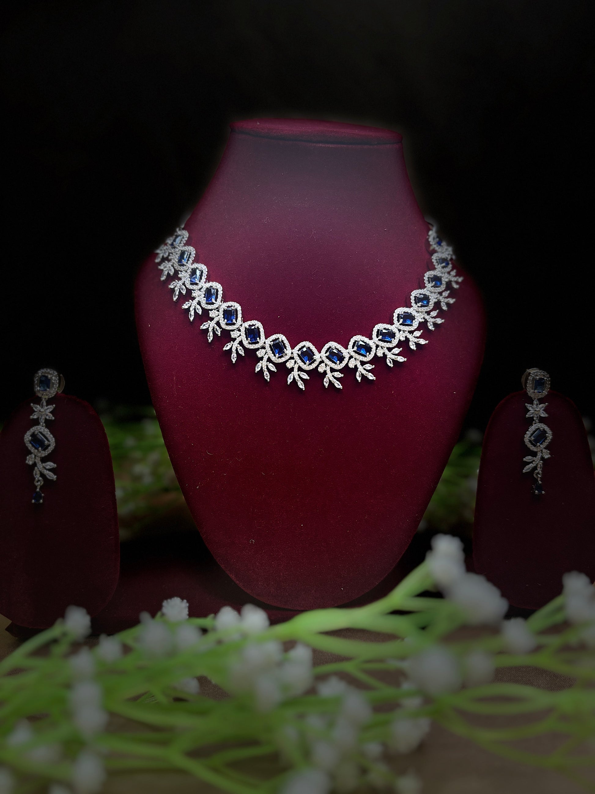 Elegant White & Blue AD Necklace Set with Earrings | Artificial Jewellery